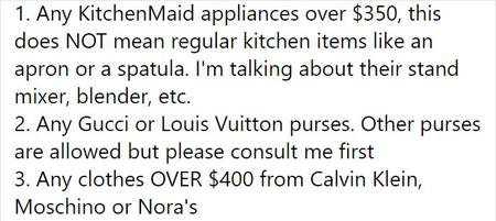 Mladenka je navela kako u obzir dolaze i kuhinjski aprati "KitchenMaid", očito ne znajući da se poznati brend kuhinjskih uređaja i dodataka točno zove KitchenAid, no uz opasku: "Bilo koji KitchenMaid kućanski aparat iznad 350 dolara, to NE znači kuhinjske predmete poput pregače ili špatule. Govorim o njihovom samostojećem mikseru, blenderu itd."