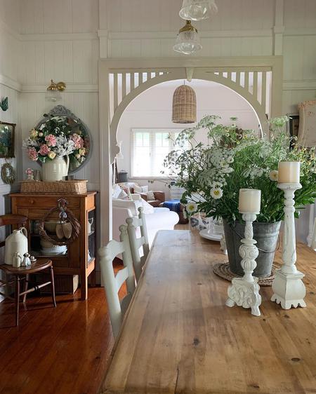 Njezinim domom dominiraju iznimno opuštajuće, nježne, svijetle nijanse, a krase ga brojni detalji iz nekih davnih vremena koji cijelu priču čine još autentičnijom, toplijom i šarmantnijom. Mnogi od njih imaju patinu i pokazuju znakove dotrajalosti, a ne mogu se odlučiti djeluje li mi svaki komad više kao da je pomno promišljen i jos pažljivije uklopljen u ostatak njezinog doma ili bi pak ovdje baš sve, što god i gdje god spušteno bilo, djelovalo nekako nostalgično, šarmantno i skladno, savršeno u svojoj nesavršenosti.