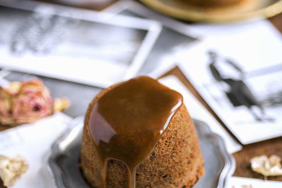 Sastojci: 100 ml vrhnja, 60 g svijetloga smeđeg šećera, 25 g tamnoga smeđeg šećera, 2 žlice maslaca, 1 žlica brendija ili tamnog ruma, prstohvat soli; kolač: 150 g datulja, 2 komada đumbira (dva komada po dva centimetra korijena), 75 ml vruće vode, 1 žličica sode bikarbone, 175 g brašna, 150 g svijetloga smeđeg šećera, 75 g maslaca, 2 jaja, 1 žličica mljevenog đumbira, 1/2 žličice cimeta, 1/4 žličice soli, prstohvat mljevenoga klinčića, 12 pekan oraha