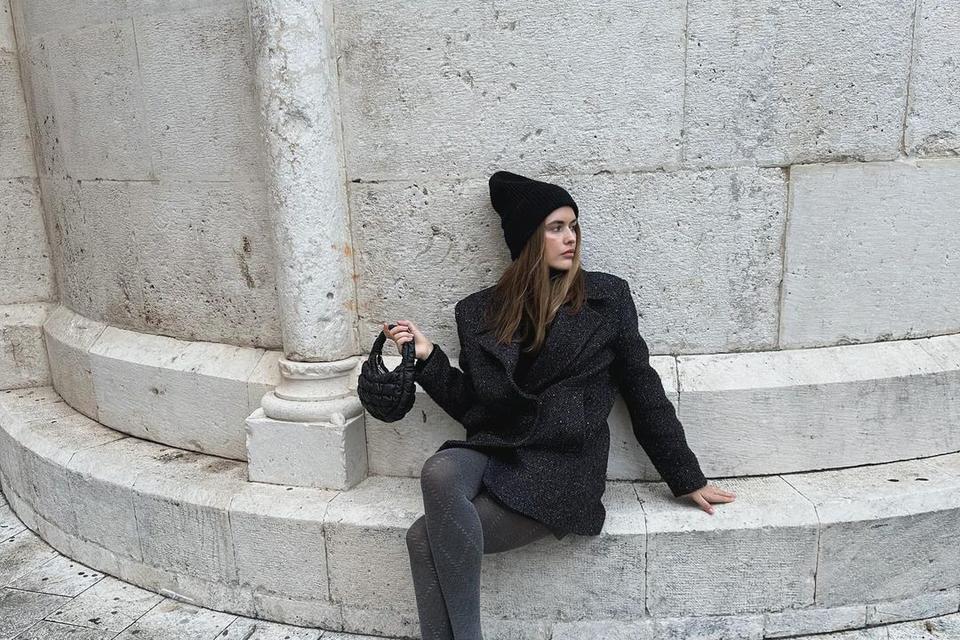Uz jako trendy COS prošivenu torbicu u mikro modelu od glatke kože, koja je osvojila modne influencerice, Anita je nosila i kožne H&M balerinke s otvorenom petom i kvadratnim vrhom te tankom zlatnom metalnom kopčom s prednje strane. S ravnim cipelama kombinirala je Calzedonia hulahupke s kašmirom, u predivnoj sivoj nijansi i s velikim rupičastim uzorkom rombova.