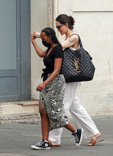 Prošivena crna torba od janjeće kože s ogromnim mjedenim YSL logotipom nije asesoar koji je privukao samo Angelinu već i nekoliko drugih slavnih dama. Nose je tako i Hailey Bieber i Zoë Kravitz, koje su bile i u kampanji za brend. Ipak, da Jolie i 17-godišnja Zahara (posebno ona, rekli bismo) vole i "obične" brendove dokazale su ušavši i u rimsku Zaru.