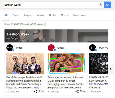 Sami dizajneri uključeni su u odabir onoga što će se prikazivati kada u Google tražilicu upišete ime njihovog brenda kako bi promovirali svoje kolekcije. Neke promjene već su u upotrebi, primjerice, upišete li u tražilicu "fashion week" prikazat će vam se novi modul s fotografijama, videima i najavama prema brendovima, koje se povezuju s njihovim web stranicama.