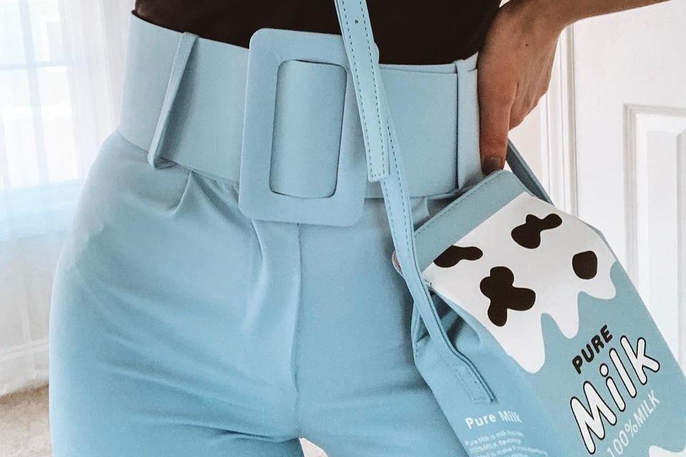 Riječ je o torbici koja nalikuje tetrapaku mlijeka. Svijetloplave je boje, a na sebi ima i natpis ''Čisto mlijeko'' te militražu i sastav. Nosi se preko ramena i izrađena je od prave kože, a naručiti se može na webshopu New Chic.