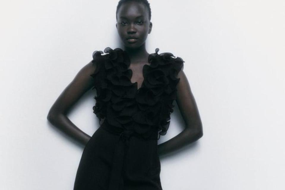 Omiljeni španjolski high-street brend u ponudi ima crni kombinezon sa zanimljivim trodimenzionalnim detaljem na gornjem dijelu. Kombinezon bez rukava s V-izrezom krase nabrani volani, a pričvršćeni remen nalazi se na visokom struku koji ističe figuru.