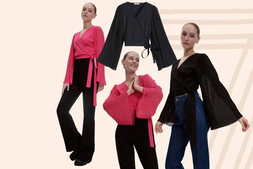 Riječ je o košulji na preklop koju posebnom čine raskošni plisirani rukavi. Zvonolika kroja i široki stvaraju lepršavi pokret dok se krećemo. Možemo ih zamisliti kako dobro funkcioniraju i u najsvečanijim kombinacijama, posebno kad je riječ o crnoj bluzi. Drugi zgodan/elegantan detalj je mašna kojom se bluza veže u struku. Naravno, preklop čini i lijep izrez na dekolteu.