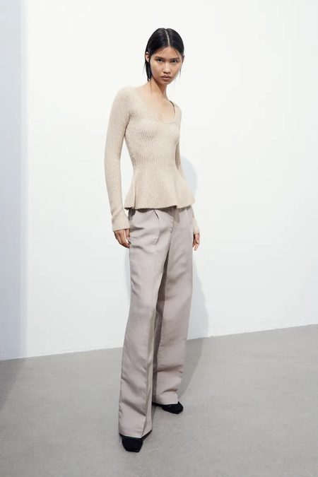 Top od rebrastog pletiva dugih rukava dostupan je u dvije neutralne nijanse, bež i tamnosivoj, a krasi ga klasičan okrugli izrez i uski kroj do struka, nakon čega se blago širi u zvonoliki peplum volan.