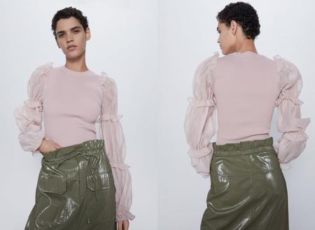 No, započnimo s time što je zajednička karakteristika ova dva modela. Riječ je o pletenom blijedoružičastoj bluzi s dugim rukavima izvedenima od organdija, dok je središnji dio izveden od elastičnog rebrastog materijala. Ono po čemu se razlikuju jest što jedan top ima okrugli ovratnik i rukave ukrašene volanima, dok drugi ima ravni izrez i duge rukave s elastičnim rubom.