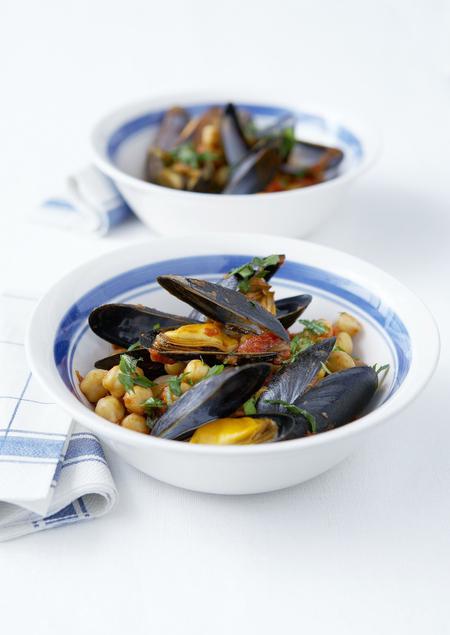 Sastojci: 2 i 1/2 šalice vode, 3/4 šalice suhoga bijelog vina, 2 lovorova lista, kg dagnji, žlica maslinova ulja, poriluk, stabljika celera, čili papričica, 1/2 glavice luka, sol, svježe mljeveni papar, 4 češnja češnjaka, 1/4 žličice šafrana, limenka konzerviranih rajčica, srednji roza krumpir, limenka slanutka