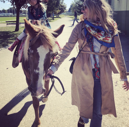 Odlično je izgledala u klasičnom baloneru i trapericama dok je uživala u društvu male Lene koja je učila po prvi puta jahati na konju. Klasičnom poslovnom stilu dodala je šarenu maramu trenutno jako popularnog printa, a na noge nabacila gležnjače sa zlatnim dodacima. I naravno, sunčane naočale.