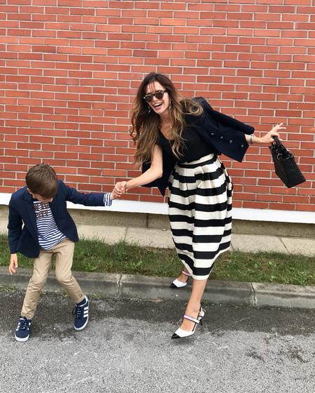 Ono što nam je posebno zapelo za oko svakako je modni odabir pjevačice i njezina sina koji su bili odlično usklađeni. Severina je za prvi dan Aleksandrove škole odjenula crno-bijelu kombinaciju, dok je sinu odjenula sličnu u plavo-bijelim nijansama. Oboje su nosili blejzere i komade s prugicama. Poznata mama na sebi je imala prugastu suknju i tamnoplavi blejzer, a cjelokupni styling zaokružila je crno-bijelim sandalama koje potpisuje talijanska modna kuća Prada, a cijena im se kreće od oko 5 800 kn. Osim skupocjenih cipela, pjevačica je imala i Dior torbicu, čija cijena iznosi vrtoglavih 25 tisuća kuna.