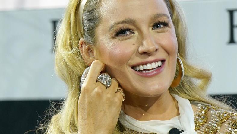 Blake Livelyna duga prljavo plava sjajno odskače od tamnijeg korijena. Divan je i ovaj dodatak za kosu, bijela svilena traka kojom je prizvala stil 60-ih.