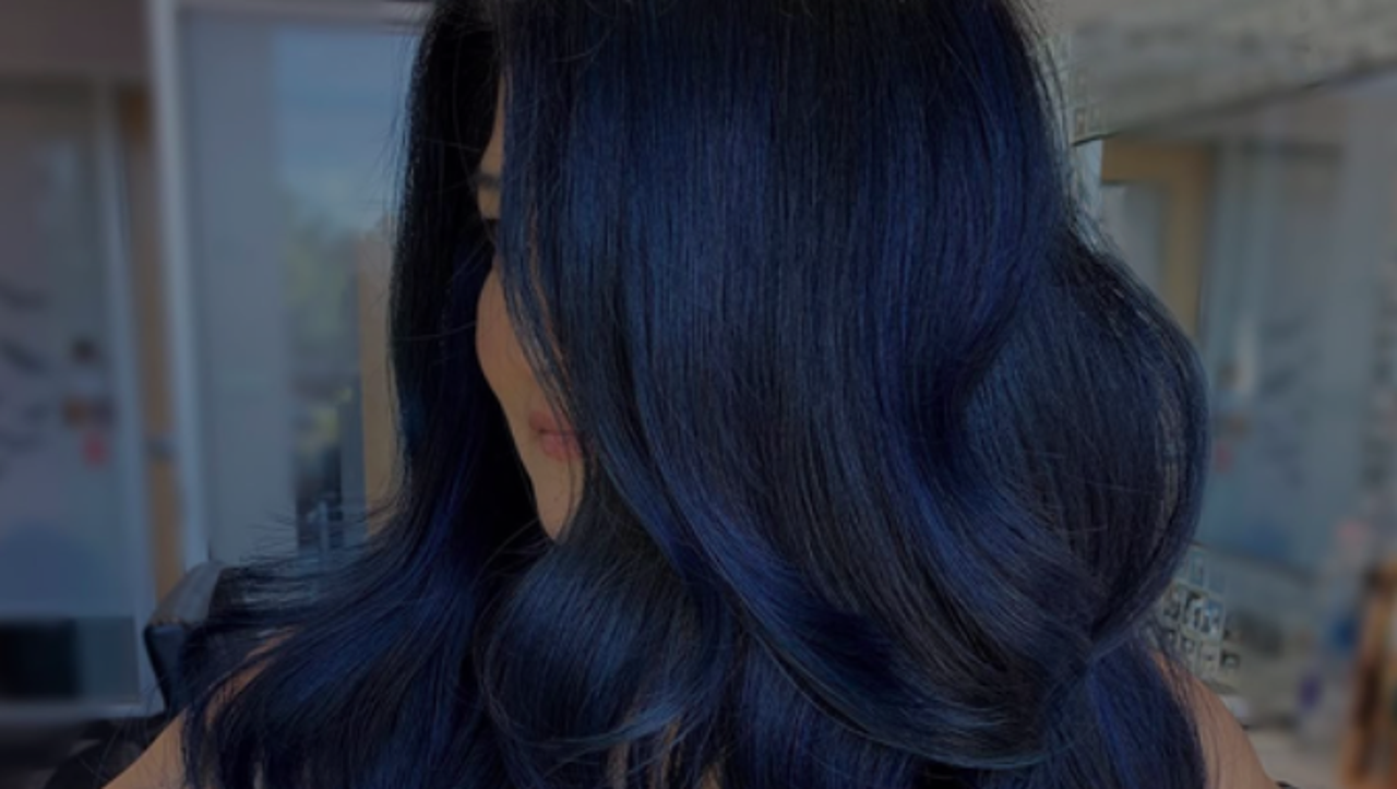 Modri balayage: suptilni modri pramenovi na crnoj podlozi daju kosi pokret i dimenziju.
