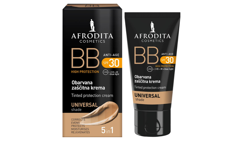 Afrodita BB Anti-Age High protection tonirana krema univerzalne je nijanse te osigurava visoku UV zaštitu sa zaštitnim faktorom 30. Lagane je i brzoupijajuće teksture te sadrži mineralne pigmente 100 % prirodnog podrijetla. Prekriva nepravilnosti i stvara ujednačen ten i prirodan izgled kože. Uz to, ona obilno hidratizira kožu te je idealan izbor za sve koji žele pojednostaviti svoju beauty rutinu.