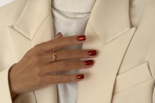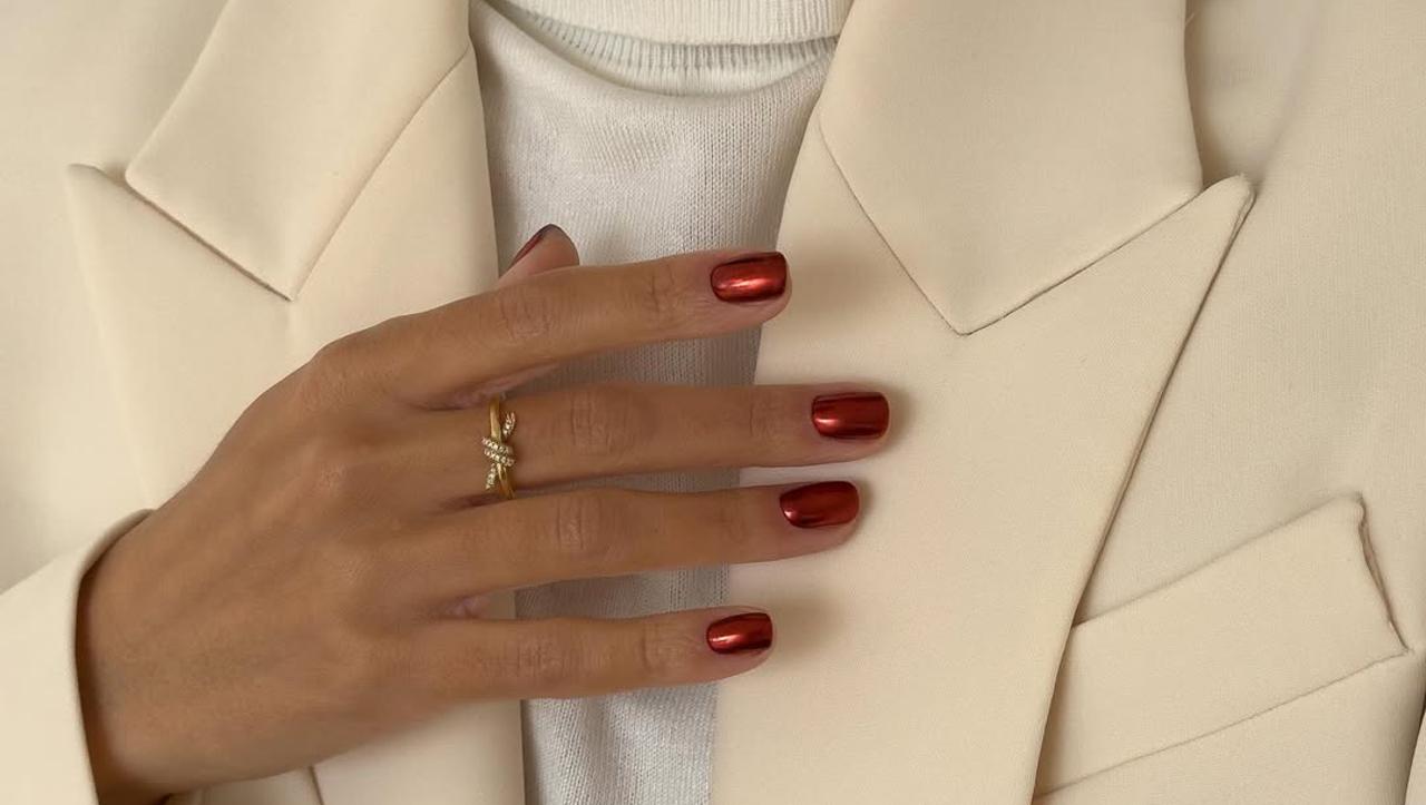 Blagdanska sezona je savršeno vrijeme za nokte koji blistaju i jednostavno mame poglede. Ako želiš manikuru koja kombinira klasičnu crvenu boju s modernim metalik ili kromiranim sjajem - onda je ovo, ta manikura. Radi se o kratkim, kvadratnim noktima u crvenoj metallic nijansi, a efekt ove manikure je poznat i kao “velvet glass nails” ili “jelly red chrome”. Sjajna, reflektirajuća završnica podsjeća na staklo ili ogledalo, i savršeno ide uz elegantne božićne i novogodišnje outfite. Takav efekt često se najbrže postiže korištenjem gel naljepnica i press‐on noktiju ili gel lakova u kombinaciji s chrome praškom. No, moguće ju je kreirati i uz pomoć klasičnih metalik lakova za nokte ili crvenih lakova uz metalik nadlak.