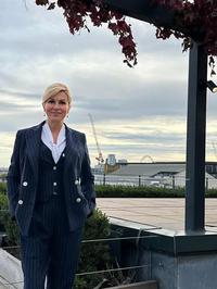 Modna lekcija Kolinde Grabar - Kitarović: Modro odijelo i bijele salonke spoj su za čistu peticu