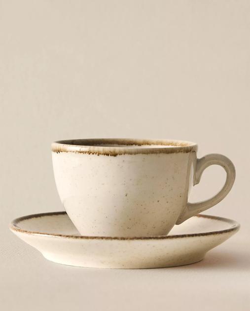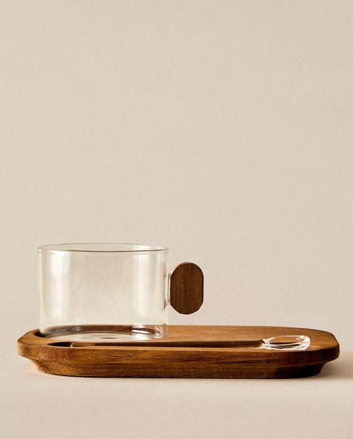 Zara Home, staklena šalica s drvenom ručkom, tanjurićem i žlicom (12,99 eura)