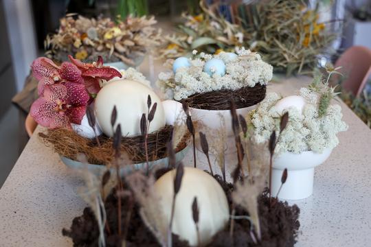 "Kroz ove uskršnje aranžmane željela sam naglasiti minimalizam, teksturu i prirodne materijale. Cica mace simboliziraju početak proljeća, islandska mahovina unosi osjećaj prirodnog krajolika, dok nojeva jaja svojim volumenom i neutralnošću daju suvremeni zaokret tradicionalnim uskršnjim motivima. Suho cvijeće sam koristila kako bih smirila cijelu priču i naglasila teksturu", govori nam Kruna.