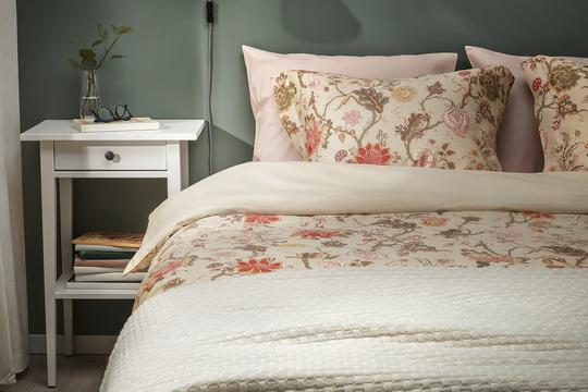 Ako želiš brzo osvježiti spavaću sobu, NÄSSELKLOCKA navlaka za poplun i jastučnica odličan su izbor. Satenski tkana tkanina daje lagani sjaj i elegantan izgled, dok neutralna sivo-bež podloga s višebojnim detaljima lako pristaje uz različite stilove interijera. Prije je koštala 22,99 eura, sada 17,99 eura.