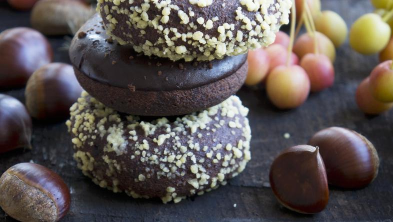 Priprema: U velikoj zdjeli izmiješajte sve suhe sastojke. U drugu posudu ulijte bademovo mlijeko, maslac i umućeno jaje te dobro izmiješajte. Polako tekuće sastojke ulijte u suhe i promiješajte. Ako je smjesa presuha, dodajte žlicu, dvije bademova mlijeka dok ne dobijete mekano tijesto za uštipke. Podijelite tijesto na dva dijela. Stavite tijesto na masni papir, prekrijte drugim papirom i razvaljajte na debljinu jednog centimetra. Pustite neka odstoji u hladnjaku oko sat vremena. Izvadite tijesto, maknite gornji papir i režite kalupom krafne, a manjim kalupom napravite rupu u sredini. U većoj posudi zagrijte dosta ulja. Kad se zagrije do 180°C (izmjerite termometrom za kuhanje), ispecite krafne i izdubljene sredine. Pecite po dvije, tri odjedanput, a kad se ispeku s jedne strane, okrenite i pecite do kraja s druge. Izvadite na kuhinjski papir da se iscijedi višak masnoće. Zagrijte vrhnje do granice vrenja, maknite s vatre i umiješajte u nj komadiće čokolade te miješajte dok se posve ne rastopi. Kad se ohlade, svaku krafnu i sredinu umočite u rastopljenu čokoladu te pospite komadićima lješnjaka i nasjeckana pečenoga kestena.