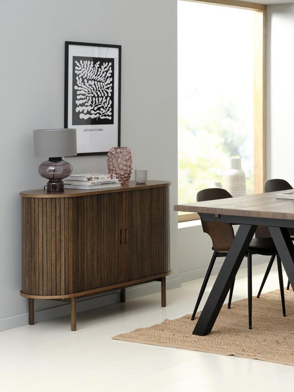 - Ova svestrana komoda s elegantnim rolo vratima dolazi u tamnom ili svijetlom hrastu i savršeno će se uklopiti u dnevni boravak, spavaću sobu ili hodnik