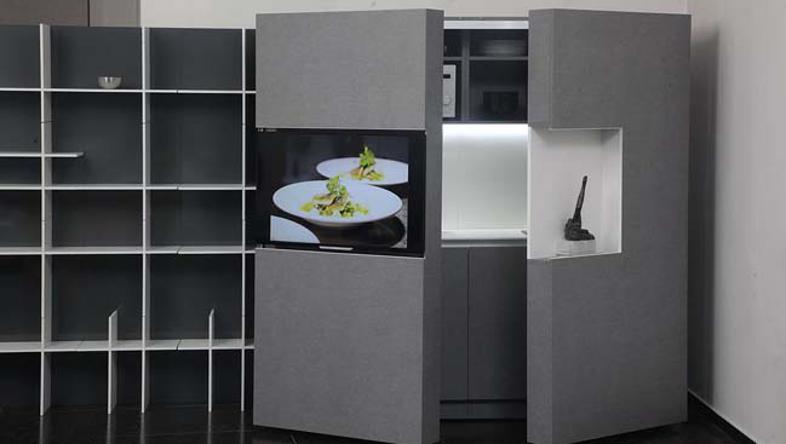 Zatvorena kuhinja izgleda kao dobro oblikovani ormar s nišom u koju se ugrađuje televizor. Otvaranjem vrata otkriva se potpuno opremljena kuhinja, sa svim aparatima. Kuhnja je posebna po tome što se kao čarobna kocka iz dvokrilnog ormara s ugrađenim televizorom (i policom za kakvu umjetničku skulpturu) pretvara u potpuno opremljenu kuhinju.