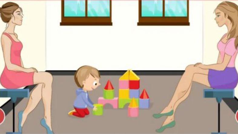 Ponuđena je slika na kojoj se sa svake strane nalazi jedna žena dok je u sredini dijete koje se igra na podu. Tvoj zadatak je odgonetnuti koja od ovih žena je majka djetetu. Pogledaj i odluči...