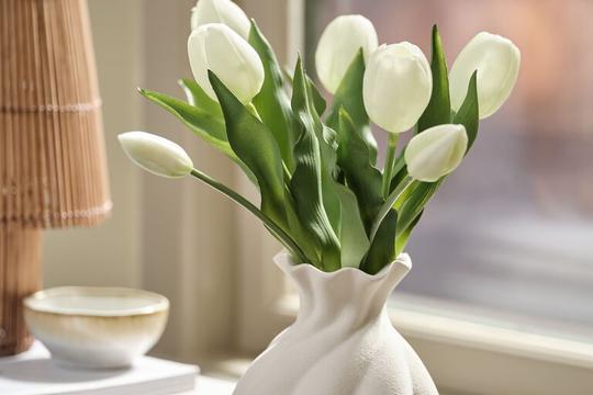 Među našim favoritima se ističe MIKKI buket umjetnog cvijeća sa 7 tulipana po cijeni od 8,50 €, koji svojim realističnim dizajnom unosi trajnu ljepotu u prostor. Dostupan je u pepeljasto ružičastoj i bijeloj boji, a savršen je izbor za manje vaze, kao decentan proljetni detalj. Ovaj JYSK buket možeš kupiti u boji po želji, a nama se sviđa i u kombinacija obje boje, za malo bogatiji buket.
