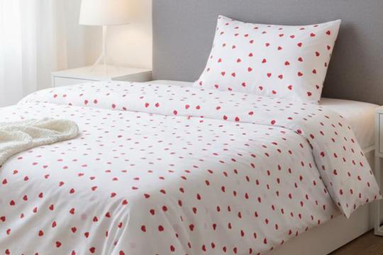 Prva posteljina sa srcima dolazi u verziji s dva lica - jedno je crvene boje sa sitnim bijelim srcima dok je drugo bijele boje sa sitnim crvenim srcima. Ova je posteljina u potpunosti načinjena od pamuka te dolazi u dimenzijama 200x200 centimetara za navlaku za poplun te 70x80 centimetara za dvije jastučnice. Cijena ovog kompleta iznosi 22,99 eura, a za kupnju je dostupan samo putem Sinsay internetske trgovine.