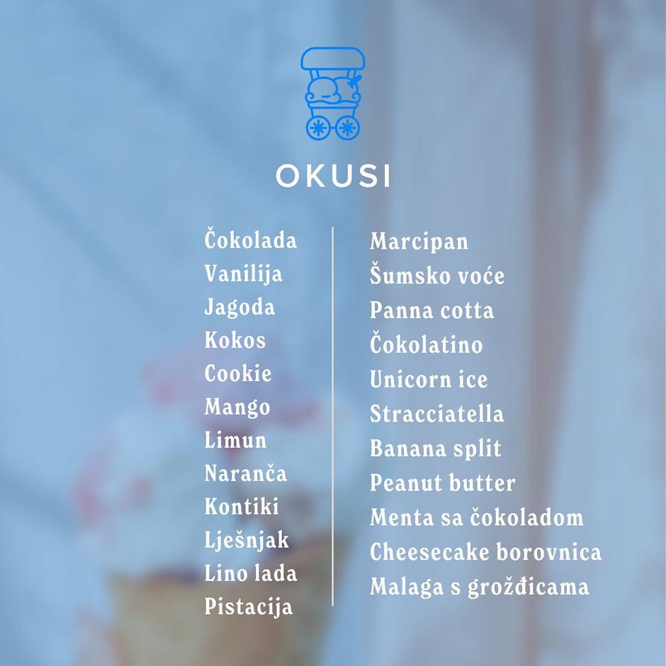 U ponudi su čak 23 različita okusa sladoleda, od klasičnih poput čokolade i vanilije, do svježih i egzotičnih kombinacija koje će oduševiti i najzahtjevnije nepce, a tu su i Ice Cocktails – ledeni štapići, savršeni za vruće ljetne svadbe. Nudi se šest neodoljivih okusa - Strawberry Daiquiri, Mojito, Gin & Tonic, Limoncello, Passionfruit Martini i Vodka & Energy, a sa svega 5% alkohola, ukusnim okusima i zavidnom dozom šarma, ovi sladoledni kokteli brzo postaju hit svake proslave.