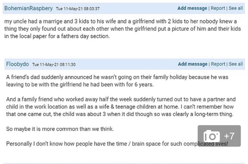 Jedan je komentirao: "Moj je ujak imao brak i troje djece sa suprugom, i djevojku s dvoje djece - nitko ništa nije znao. Saznali su tek kad je djevojka stavila sliku njega i njihove djece u lokalne novine u rubrici za očev dan."