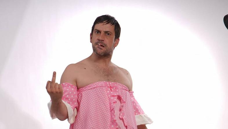 - 40-godišnji glumac uskočio je u ružičastu haljinu, uzdignuo srednji prst dok je u ustima imao cigaretu