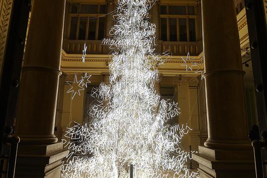 Saša Šekoranja, naš poznati slikar, dizajner i cvjećar, već godinama oduševljava Zagrepčane i goste glavnog grada Lijepe Naše prigodno uređenim izlogom svog Cvjetnog ateljea u ulici Kralja Držislava 10. Ovaj umjetnik neiscrpne mašte ove je godine otišao korak dalje te je u samom srcu Zagreba jučer otvorio svjetlosno-zvučnu instalaciju od, blještavim bijelim svjetlom, ispisanih riječi pjesme 'Prvi snijeg', koje stvaraju formu bora visokog desetak metara.