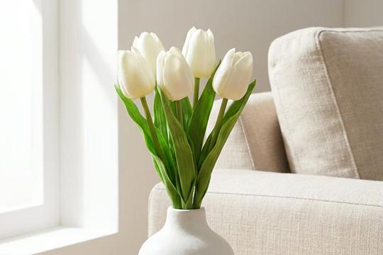 Ovaj buket se sastoji od pet tulipana bijele boje te izgledaju sasvim prirodno - bijela boja je blago 'prigušena', listovi su uvjerljive zelene boje i teksture, a glave tulipana su tek blago otvorene. Baš zato što su tako nježni i suptilni, ovi umjetni tulipani će se vrlo lako uklopiti u baš svaki interijer i mislimo da će samo najoštrije oko prepoznati da se ne radi o pravim biljkama.