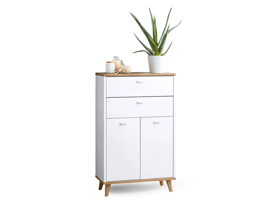 Drugi Lidl kupaonski ormarić je nešto drugačiji. A riječ je o ormariću koji je također sa smeđom plohom i nogicama te bijelim vratima, ali u njega stane više toga. Ovaj ormarić je idealan za odlaganje kozmetike, sredstava za čišćenje i svega onoga što želimo sakriti od oka kako bi prostorija izgledala urednije. Ovaj Lidl kupaonski ormarić ima dvije ladice i dvoja vratašca te je vrlo prostran, a cijena mu iznosi 59,99 eura.