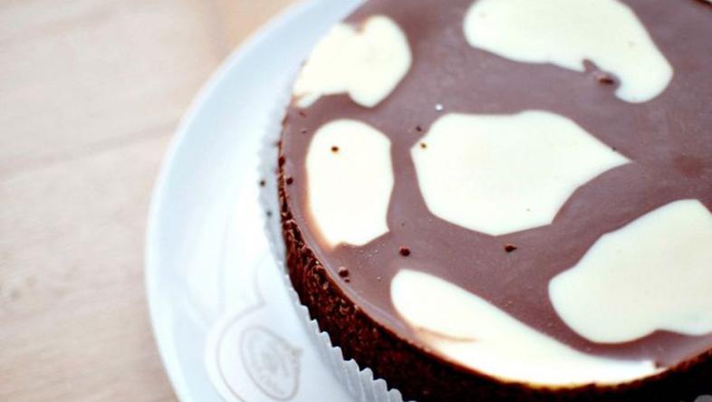 3. U okrugli kalup za torte stavi foliju kojom ćeš prekriti cijeli kalup (i dno i sa strane) pa unutra izlij bijelu smjesu i pola tamne. Kako bi dobila karakteristične Milka 'fleke' posluži se žlicom i naizmjenično ulijevaj bijelu pa crnu smjesu. Na smjesu od pudinga dodaj ostatak slatkog vrhnja pa ostatak smjese od pudinga i mliječne čokolade.
