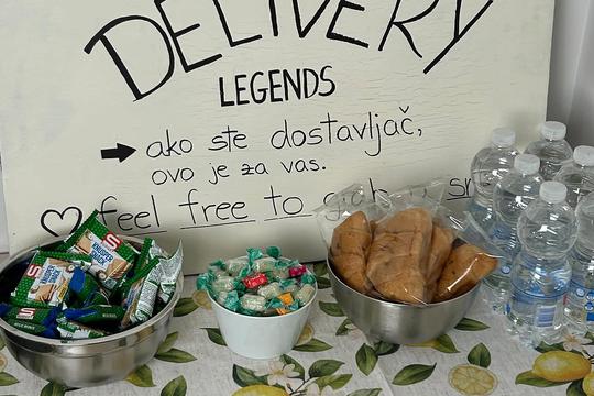 Naime, Riva je ispred svojih ulaznih vrata napravila malu 'postaju' s čokoladicama, kroasanima, bombonima i vodom koji su namijenjeni dostavljačima, a s kojima će si malo zasladiti dan. Naravno, dan im neće zasladiti samo slatkiši, već i sama gesta kojom im je Riva pokazala zahvalnost na uloženom trudu koji, svi ćemo se složiti, kada količina posla i drugih obaveza dosegne maksimum, nije baš jednostavno pokazati.