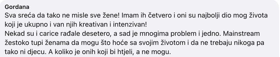 Naravno da nije ok - ako postoje drugi ljudi koji ne mogu imat djecu, a žele, onda je logično da ih iz solidarnosti barem imaju ovi koji mogu, a ne žele. Ne moraju baš deset komada - carice su toliko rađale u vrijeme kad je postojala šansa od 50 posto da dijete neće preživjet do petog rođendana, a nije bilo ni Netflixa, ni jeftinog Ryanaira, ni ženskih prava - ali BAREM jedno svi možemo… ako možemo. Ako ne zbog sebe, onda dajte barem zbog Gordane.