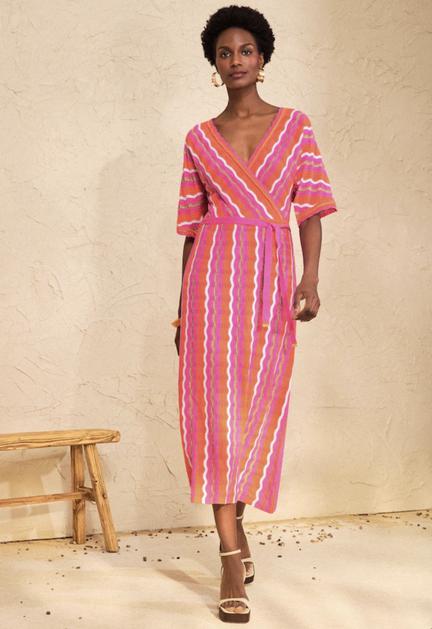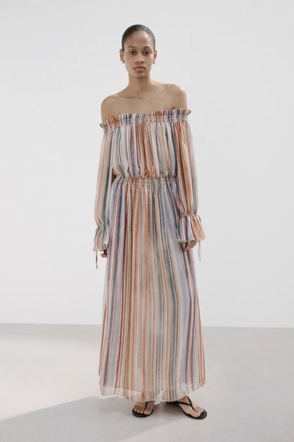 Prugasta haljina sa spuštenim ramenima (79,99 eura)