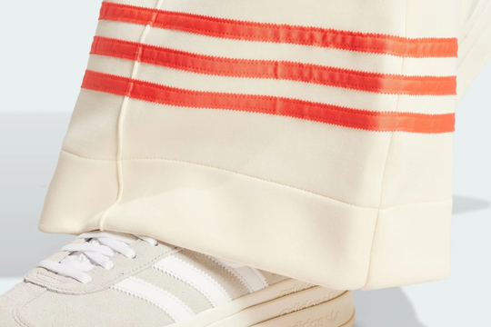 Prepoznatljive tri linije, jedan od najdugovječnijih vizualnih kodova brenda, ovdje su pomaknute s očekivanog mjesta. Umjesto da prate cijelu siluetu, koncentrirane su uz rub jedne nogavice, gdje izlaze iz logotipske sfere i nastavljaju se kao dekorativni element. Taj pomak, iako suptilan, mijenja percepciju, linije više nisu samo znak prepoznatljivosti, već ulaze u područje ukrašavanja. Postaju gotovo grafički detalj, element koji razbija monotoniju i uvodi novu razinu vizualne igre.
