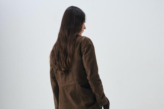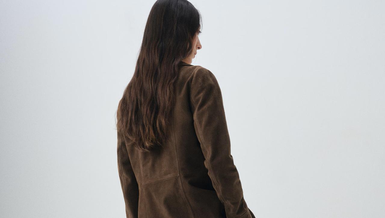 Jakna brušene kože upotpunjuje odijelo s ravnim krojem, klasičnim košulja ovratnikom i praktičnim džepovima s preklopom. Dugi rukavi i prednje kopčanje s gumbima stvaraju chic i minimalistički dojam, dok unutarnja podstava osigurava udobnost. Trenutačna cijena jakne je 299,99 eura.