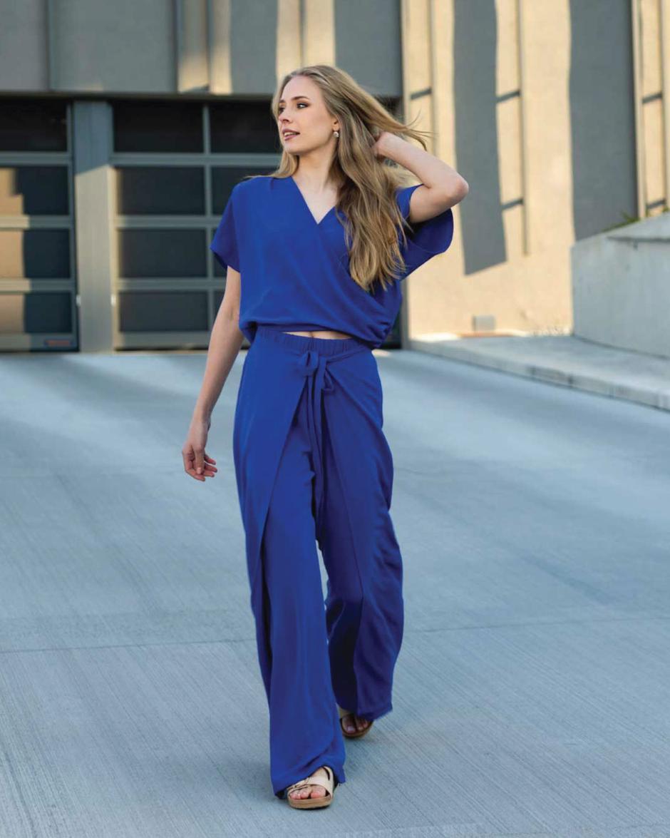 U pitanju je komplet koji se sastoji od topa kratkih rukava s preklopom koji potom čini V izrez. Dodatnu strukturu i opuštenost mu daje nešto uži donji porub koji čini da ovaj top djeluje lepršavo. Lepršavost ovog topa izvrsno se slaže s dugim, širokim hlačama koje sa strane svake nogavice imaju po još jedan sloj tkanine koji ostavlja dojam da smo preko hlača odjenuli još nešto. Udobnosti ovih hlača doprinosi i elastičan struk, a još opuštenijima ih čine i trakice koje na struku možemo zavezati u mašnu.