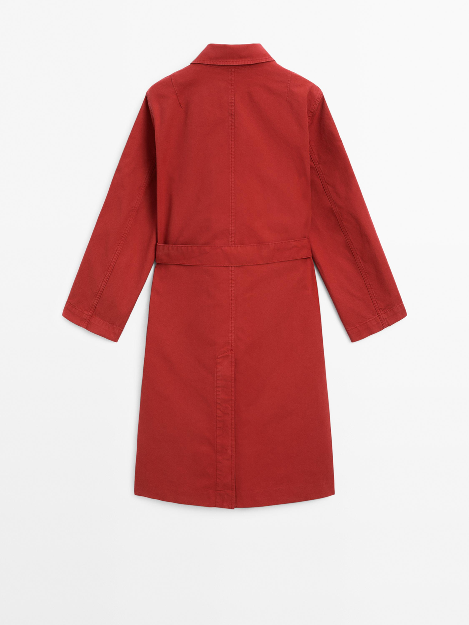 U pitanju je baloner koji je u potpunosti načinjen od pamuka, a koji dužinom seže do koljena. Ravnog je kroja, ali struk naglašava crvena traka od istog materijala koja se može zavezati u čvor. Odmah ispod trake, nalaze se dva džepa koja su postavljena ukoso i tako kroj balonera čine malo zanimljivijim. Ono po čemu se ovaj baloner razlikuje od onih klasičnih su gumbi koji su zapravo sakriveni. Vidi se tek jedan, onaj koji se nalazi odmah ispod kragne. Sakriveni gumbi se nalaze i na stražnjoj strani balonera i to na prorezu koji se nalazi na sredini što nam omogućuje da kontroliramo koliko će baloner biti lepršav.