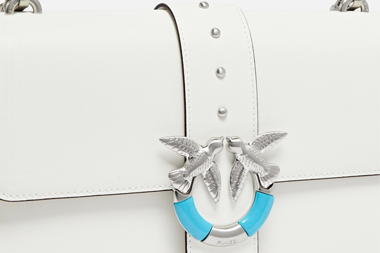 Nova Pinko torba izrađena je od mekane kože i dolazi s upečatljivom kopčom golubica u krugu u srebrnoj boji, ali je ovoga puta kopča ukrašena tirkiznim umetcima koji daju savršenu dozu boje minimalističkoj bijeloj silueti. Detalji tirkiza na nakitu kao i modnim dodatcima bili su veoma popularni prošlog ljeta, a čini se da se trend nastavlja i ove godine. Suptilni plavi detalj čini veliku razliku, i bijelu torbu, koja zna imati implikaciju "nezgodne za nošenje", ipak čine manje ozbiljnom.