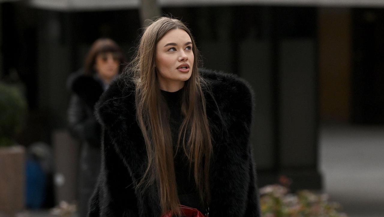 Ova simpatična mlada dama odabrala je kratku crnu vunenu suknjicu i crni pulover visokog ovratnika, a styling je upotpunila kratkom crnom krznenom bundicom koja je u najvećoj mjeri doprinijela glamuroznosti i sofisticiranosti kombinacije. Crne prozirne najlonke ovom su looku dale ženstvenu i zavodljivu notu, a visoke crne čizme s tankom potpeticom koje su sezale preko koljena, dodatno izduživši njezinu siluetu i pridonijevši odvažnosti, bile su pun pogodak.