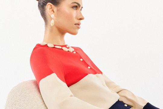 Crveni gornji dio vizualno osvježava ten i daje dozu energije, dok bijeli donji segment stabilizira cjelinu i unosi osjećaj smirenosti i ravnoteže. Mohito kardigan stil s gumbima i zatvorenim ovratnikom čini ovaj komad savršenim za radno okruženje, ali i dovoljno fleksibilnim za različite stilističke kombinacije. Može se nositi samostalno, kao središnji element outfita, ili u slojevitim kombinacijama ispod sakoa ili kaputa. Donji dio, odnosno pasica, inspirirana je navy stilom te je gotovo "sakrivena" dubokom tamnom plavom nijansom.