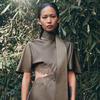 Ravni donji rub s bočnim prorezima uvodi dinamiku u inače smirenu siluetu, haljina ne prati tijelo u klasičnom smislu, nego ga više okružuje, dopušta pokretu da postane njezin ključni element. Ima fini visoki ovratnik, evocira dolčevite koje smo ostavili u zimskim danima. Ipak, trend prekrivanja vrata vidimo i kroz svijet jakni, pa je taj modni moment očit i u svijetu haljina. No, iza se dešava nova modna igra, trake se vežu u mašnu ili lepršaju, a vidi se i dio leđa.