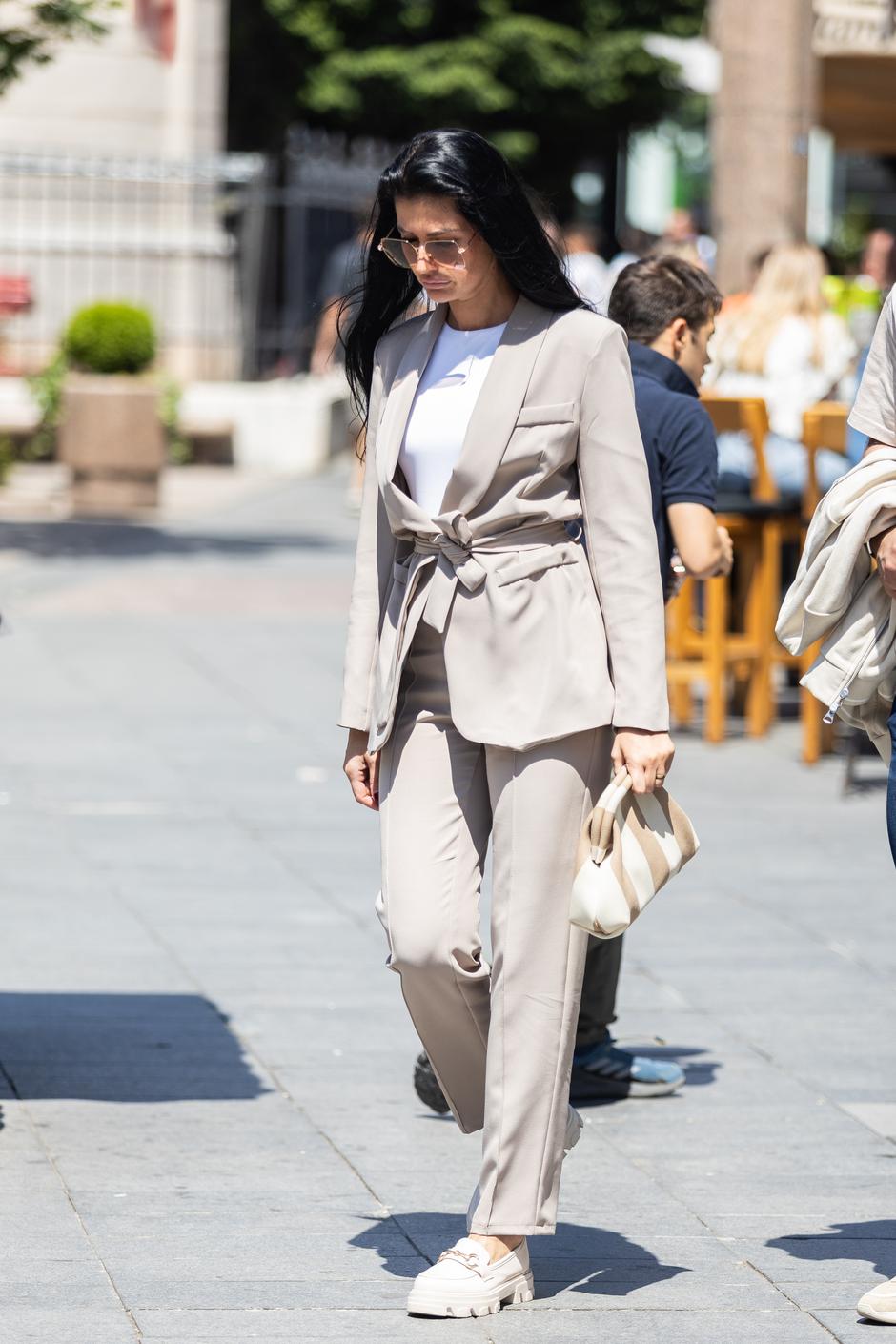 Druga dama odlučila se za nešto strukturiraniji model, s klasičnijim blejzerom u istoj boji te također pojasom koji stvara ženstvenu siluetu, a kombinirala ga je s bijelom pamučnom majicom, suptilnom torbicom u sličnim neutralnim nijansama i chunky bijelim mokasinkama koje su cijeloj kombinaciji dale moderni, urbani pečat.