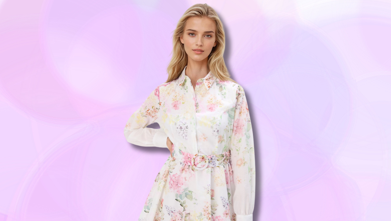 Ovu smo pronašli u Mohitu, a radi se o kratkoj, zvonolikoj haljini dužine gotovo do koljena koja ima duge, blago puf rukave. Bijele je boje, a krasi ju romantični cvjetni uzorak jorgovana, hortenzija i ruža u nježno ružičastim, ljubičastim, zelenim i žutim nijansama. Baš kao i Zimmermann haljine, i ova iz Mohita se u gornjem dijelu može kopčati gumbima, a ima i remen od istog materijala. Predivno!