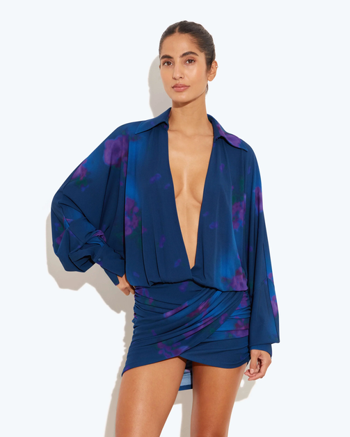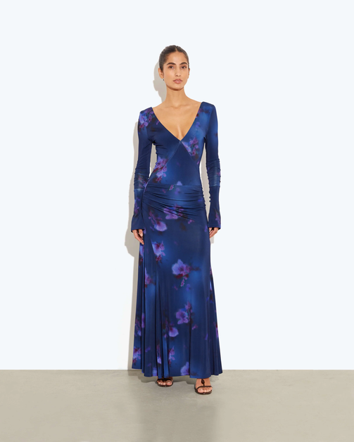 Mariella, duga modra haljina s ljubičasti detaljima (325 eura)
