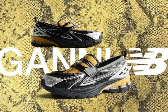 Ovaj model je savršen primjer modnog oksimorona. Na prvi pogled, gornji dio cipele podsjeća na klasičnu, elegantnu mokasinku. No, pogled prema dolje otkriva robusni, sportski potplat preuzet s legendarnog modela tenisica za trčanje 860v2, opremljen naprednom ABZORB SBS tehnologijom za maksimalnu udobnost i apsorpciju udaraca. Ganni je dodao svoj prepoznatljivi pečat kroz odvažni zmijski uzorak u zlatnim tonovima koji se penje uz jezik cipele, sjajne crne lakirane detalje i suptilne srebrne presvlake.